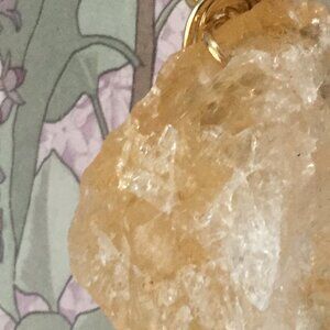 Gold Tone wire wrap encases a Brazilian Rough Cut White Crystal Quartz
