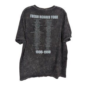 Immerse yourself in the nostalgia of Garth Brooks' legendary Fresh Horses Tour with this vintage tee. Its distressed black fabric and tour dates on the back recount a musical journey from 1996-1998, making it a timeless piece for fans and collectors alike.