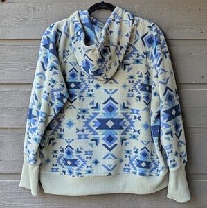 Great preowned condition fleece tribal aztec pullover hoodie from Colosseum Outdoors. Sage green with shades of blue tribal allover pattern. Stretchy ribbed knit panels. Kangaroo pocket. Attached hood with adjustable drawstring. Machine washable. Clean. Light wash wear. No flaws.