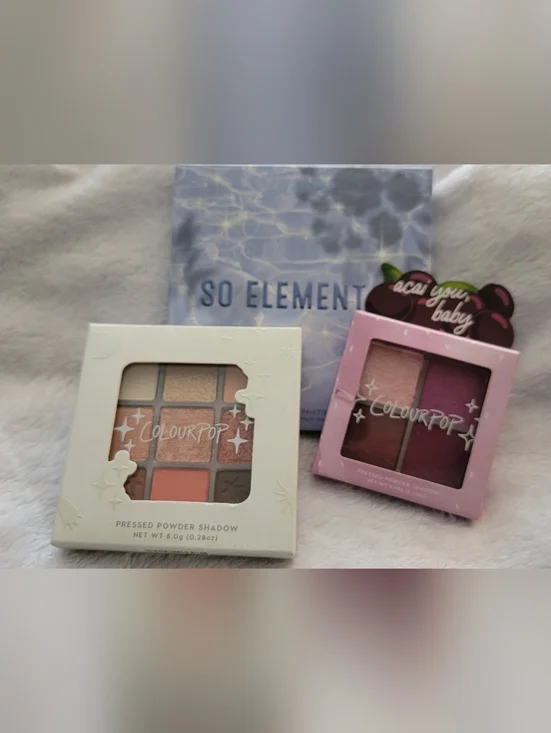 Set of ColourPop pressed powders with pink, peach and neutral shades. Mix of matte and shimmer finishes. Great for soft everyday looks or layered evening shimmer. Smooth, blendable pigments for buildable color.