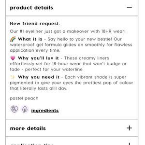 Colourpop Waterproof 18 Hour Creme Gel Liner. Color glides on smoothly for comfortable application in the waterline. Creamy formula makes blending super easy & formula dries down for long lasting wear