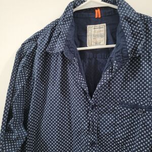 The product is a men's button-up shirt by Alexander Julian in size XL with a blue and white floral pattern. It features long sleeves, a collared neckline, and a button closure. The shirt is made of a cotton blend with accents of spandex for a comfortable fit. Suitable for travel, casual, and business occasions, this shirt is easy to care for and can be worn in all seasons. It also includes pockets and is ideal for the summer, fall, and spring seasons.