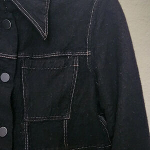 Black wool (100% Wool). Jacket. Long sleeves. Center front button closure. Pockets. Contrast topstitching. This has been shrunken, fits like an XS. Length from shoulder to hem is 17" overall in fair pre-owned condition.