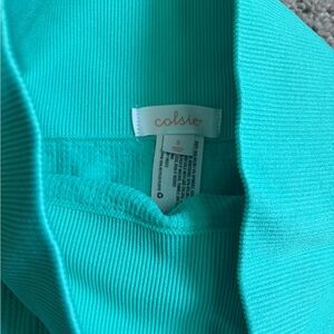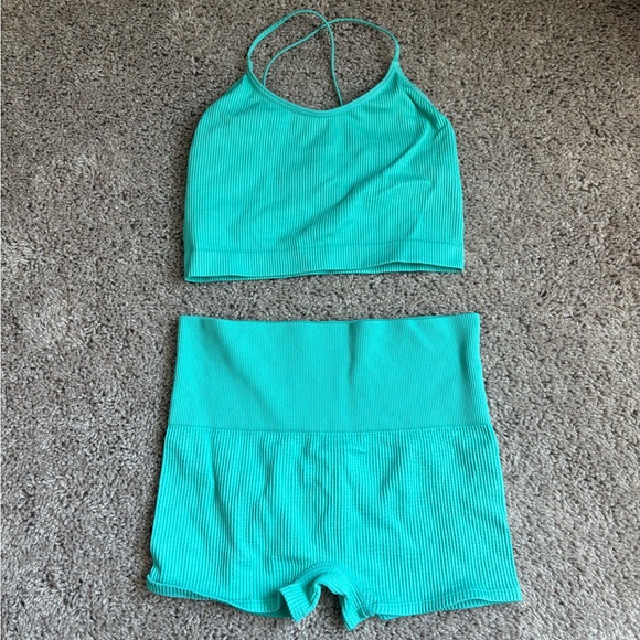 Aqua ribbed set with halter top and high-waisted shorts. Comfortable and stylish.
