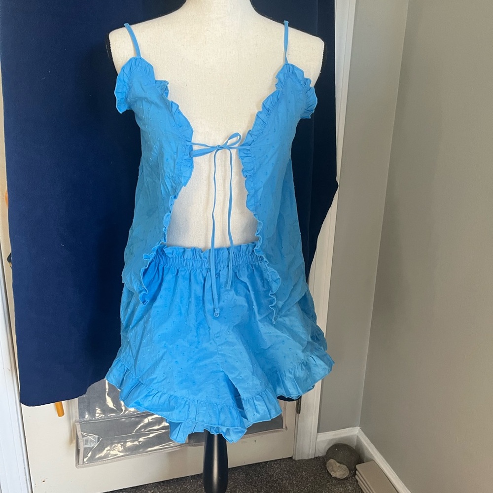 Charming blue pajama set with ruffled details. Lightweight and stylish for a restful night.