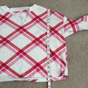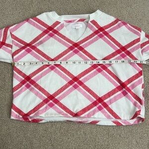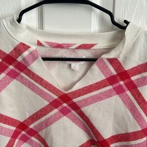 A fun and comfortable sweatshirt featuring a unique plaid pattern in shades of red and pink. This long-sleeve pullover top has a relaxed fit and a flattering V-neck design. Wear it for casual outings or loungewear, a pre-owned versatile piece. See all photos for wear and measurements. Smoke and pet free home.