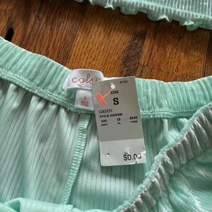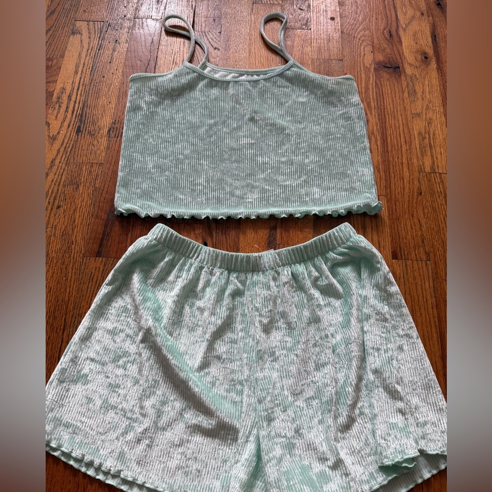 Soft ribbed pajama set with a light green hue. Features a sleeveless top and matching shorts. Ideal for cozy nights.