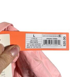 Stylish pink bodysuit with front and back keyhole details, adjustable straps, and ruched back. Size L with tag indicates $20 retail price. Made in China.