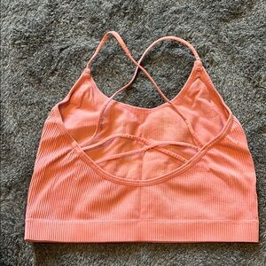 Stylish ribbed crop top. Features criss-cross straps. Perfect for casual wear.