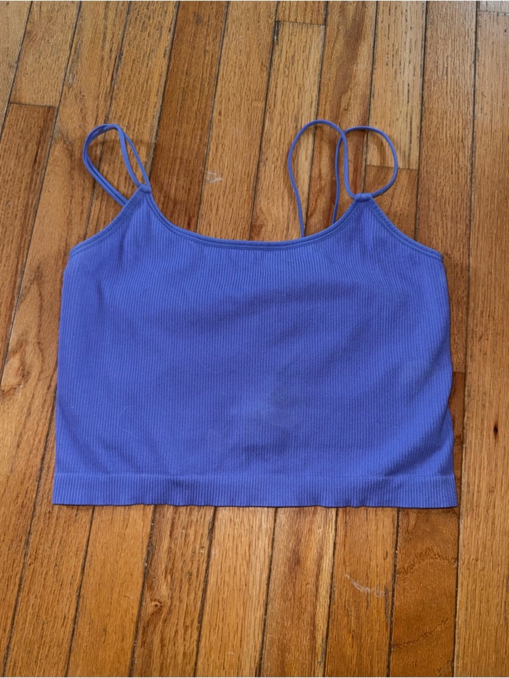 Colsie ribbed crop top with thin double straps. Soft, stretchy knit fabric. Casual, versatile piece for layering or warm days. Clean lines and simple silhouette.