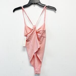 Soft and breathable pink bodysuit made of cotton and spandex with spaghetti straps and a stylish cutout. Designed for comfort and everyday wear. • Spaghetti straps for a delicate look • Stretchy fabric for a comfortable fit • Stylish cutout detail on the front • Easy-care cotton and spandex blend Measurements Length = 27 in. Pit to pit = 14 in. Condition: New With Tags Size: S