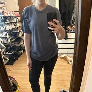 This blue tee is so soft. Has intentional pilling on the fabric. Comfy fit. 20 in armpit to armpit. 27 in length.