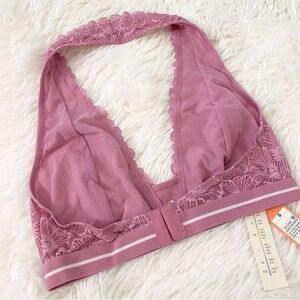 Pink lacy bralette halter top. Hook and eye closure. Striped band.