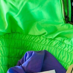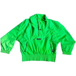 Vintage Coltech neon green windbreaker style jacket. Half up zipper, two zippered pockets and one middle buttoned pocket. Zipper opening on the side. In great condition.