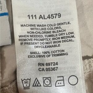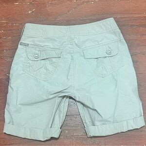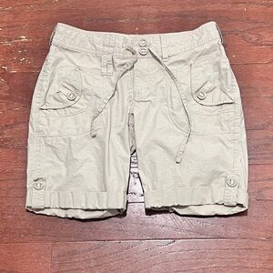 Columbia 4 pocket khaki shorts. All pockets button closed. Fly is a zip with two button at top. Waistband also has a tie. 100% cotton. Ladies size 4, 12L