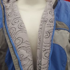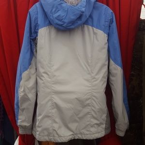 In good conditions hardly used it's not heavy much keeps you warm has a hoodie. It does have a small light stain on the lower back side you can barely see it