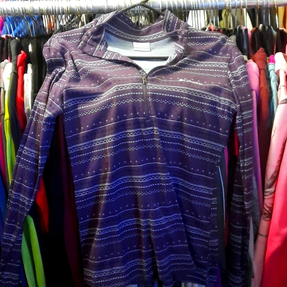 This is a purple and blue 3/4 zip-up hoodie . It is a size medium
