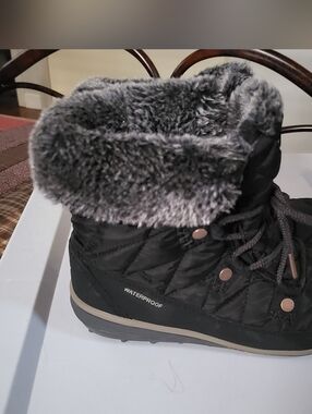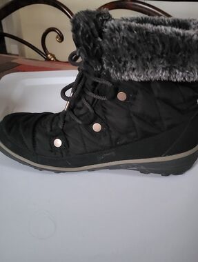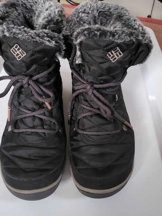 Columbia,ankle high snow boots,size 8,wedge low heel,lace up, faux fur trim, rubber sole, water resistant, Pre-owned in excellent condition no flaws little to no use.