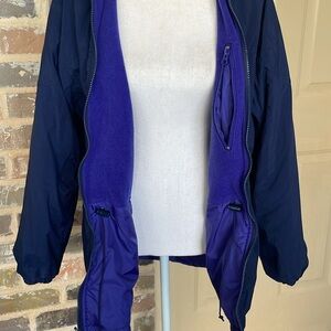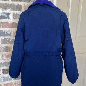 Vintage 90’s Columbia Ski Jacket Navy Nylon Outter layer and Royal Blue Fleece interior Size Medium. Cinched waistband with toggles. Glove loops on elastic cuffs. Zipper side pockets with interior zip pocket. Excellent condition. Flat measurements below.