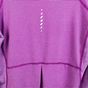 Columbia Lightweight Active Pullover Jacket Top. Womens size M. Purple striped pattern print. 1/2 zip front collar. Breathable, light material. Reflective back pattern for visibility. Perfect for running, outdoor activities, on the go, athleisure wear, layering. Body: 87% Polyester; 13% Elastane Side panel: 88% Polyester; 12% Elastane Machine washable In very good pre-owned condition with no rips, tears or large stains. Small piece of missing thread on one arm hem, does not effect wear. See photos for details and measurements.