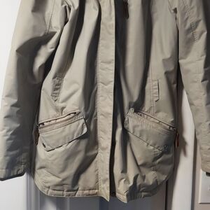 Stylish Columbia jacket with a cozy hood.Preloved womens Columbia winter jacket, size XL. I believe it's a Carson Pass style. It's lightweight but warm. It has omni heat technology, lots of pockets, and a removable hood. Doesn't include the belt. Features multiple pockets. Perfect for chilly weather.