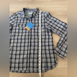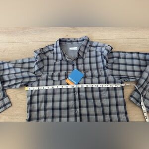 Columbia checkered shirt with button-up design. Features black and gray pattern. Ideal for everyday wear.