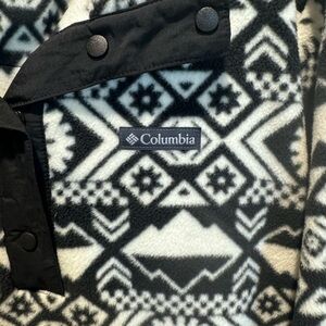 Cozy Columbia fleece with geometric design. Features button-up collar.
