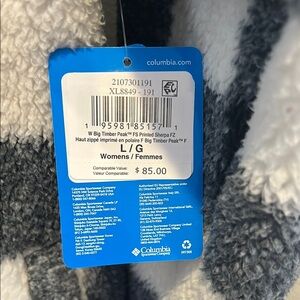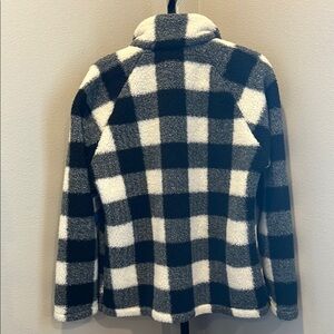 Warm fleece jacket with a plaid design. Features a zip-up front and cozy collar.