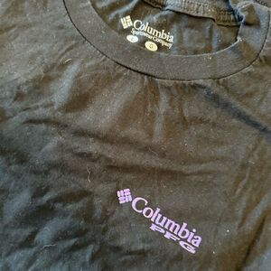Columbia black t-shirt featuring a purple logo. Comfortable and stylish.