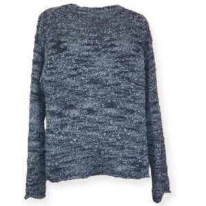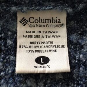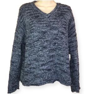 Columbia women’s nubby v-neck sweater in size large. Long sleeves. Marled denim color blues. Rolled hem and cuffs. 87% acrylic/13% wool. Very good pre-owned condition. No stains or flaws. Hand wash.