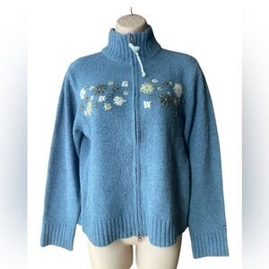 Columbia Blue Knit Zip Cardigan Sz M Embroidered Flowers Long Sleeve Work Casual