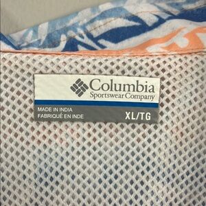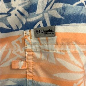 Columbia shirt with a vibrant blue and orange pattern. Perfect for casual outings.