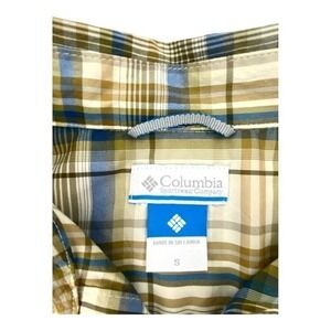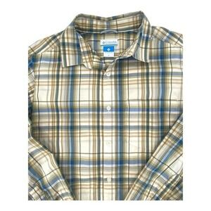 Columbia Blue and Tan Plaid Long Sleeve Shirt Polyester Nylon Blend Mens S