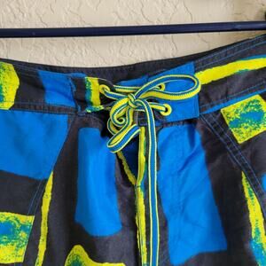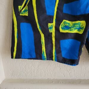 Features: blue, green, neon, psychedelic, retro, abstract, tie string belt, omni shade, omni shield, fishing, swim trunks