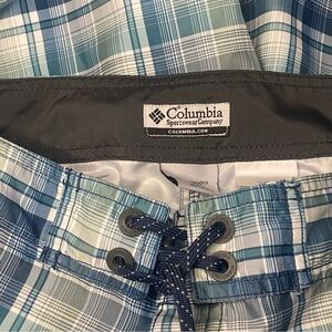 Columbia Board Swim Shorts Men 38”x10.5” Blue Green Plaid 100% Polyester