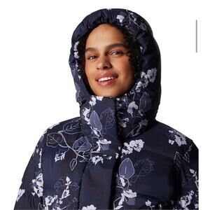 The Columbia Boundless Days Print Long Down Jacket in Collegiate Navy is a stylish and functional outerwear option for women in size 1X. Made with polyester outer shell material and lined with polyester, this jacket features a solid blue color with a floral accent. The long length and zip closure make it perfect for travel, casual outings, or workwear during the winter, fall, or spring seasons. With a hooded design and insulated construction, this puffer jacket by Columbia combines practicality with a touch of collegiate charm.