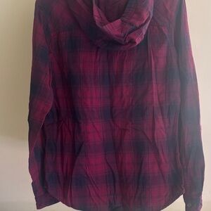 Stylish plaid shirt with a hood. Features burgundy and navy colors. Perfect for casual wear.