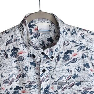 Columbia Button Down Shirt Short Sleeve Mens M Beach Umbrella Palm Tree Sailboat