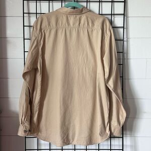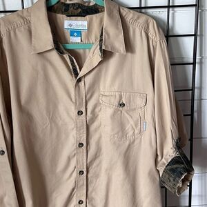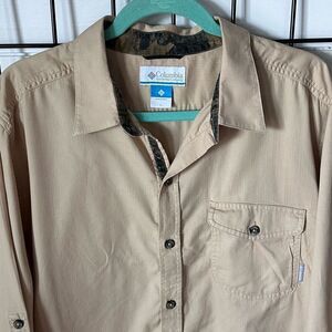 Columbia Button Up Shirt Men’s L Beige Roll Tab Sleeve Flip Cuff Camo