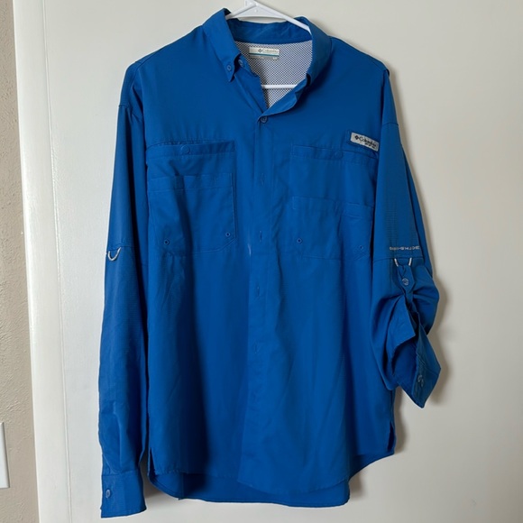 Long-Sleeve Columbia PFG button-up. Only worn a few times. Like new condition. Can roll the sleeves up or have them down as shown in pictures. Does have a spot on the front, believe it will come out. Does run big. Smoke-free home.
