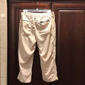 Gently used Columbia Capri pants size 6. Waist 15”, inseam 22. Back and leg zip pocket. Waist has adjustable button to cinch it in
