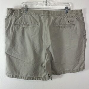 Columbia Cargo Shorts Men XXL Cream Zip Front 100% Cotton Inseam 6.5" Fishing, outdoors, side elastic at waist, hook and loop closure on cargo pockets, flat front, very good condition