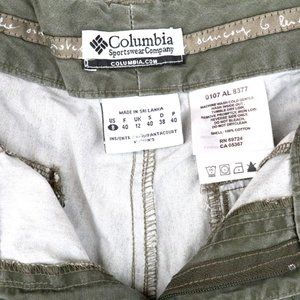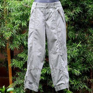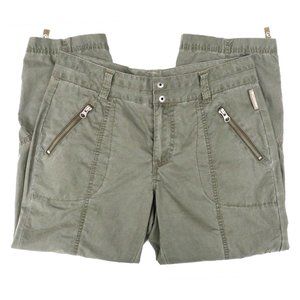 Capri pantacourt cargo type pants in an army green color. Unworn and in perfect condition. There are five pockets: two zippered and one small one in front and two in rear. Nylon blend fabric, machine wash cold. Waist = 31" Inseam = 24" Rise = 9.5" They are size 8, but fit more like a 6.