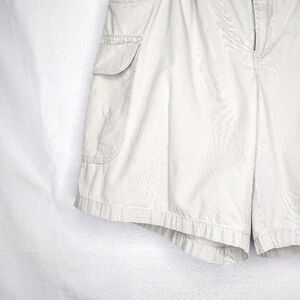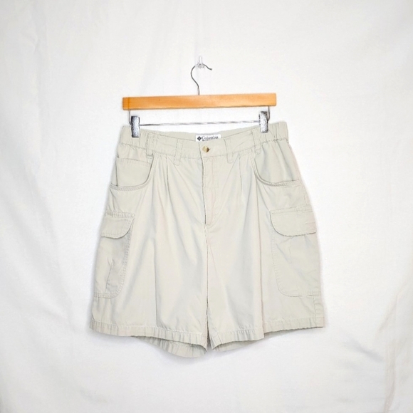 Columbia Cargo shorts. Light taupe beige/gray. Two front pockets, two side cargo velcro pockets, two button up back pockets. Pleats in front. Some light signs of wear, no stains. Waist 34, inseam 8".