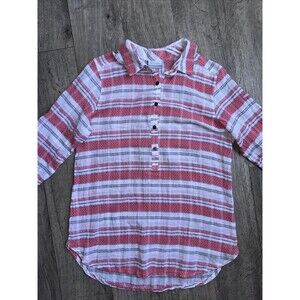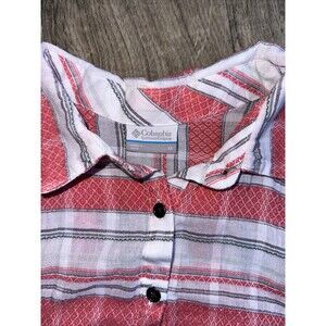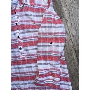 The Columbia Casual Red Striped Long Sleeve Button-Up Shirt is a stylish and comfortable option for women looking for a versatile wardrobe staple. Made from 100% cotton, this shirt features a classic collared neckline, button closure, and a striped pattern in a vibrant red color. Perfect for casual occasions, the shirt can be machine washed for easy care and has a regular fit with a comfortable 3/4 sleeve length. With its outdoor theme and basic style, this Columbia shirt is a practical choice for summer and spring seasons, and can be easily paired with jeans or shorts for a casual yet chic look.