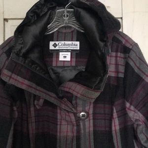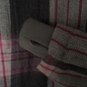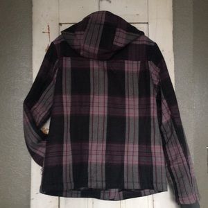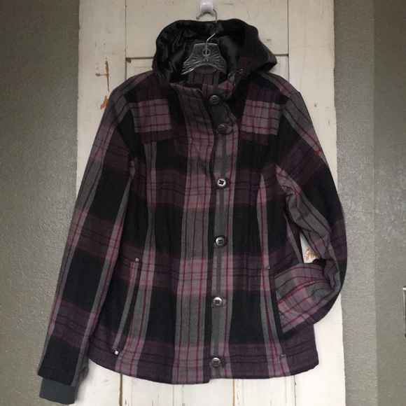 Maroon and grey plaid zipper coat with buttons, hood and thumb holes. Lightly warn 1 season.