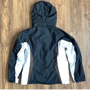 Black, brown and white. This is the outer part of the coat only, does not include lighter inside jacket. Full zip and velcro closures on front of jacket and wrists. Zip side pockets and mesh inside pockets. Measures 22.5" pit to pit and 26" from shoulder to hem. NO TRADES