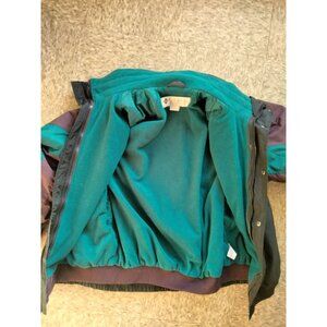 This Columbia 2-in-1 jacket for men is a vintage piece from the 90s that features a double zip and radial sleeves. The outer shell is made of polyester and the inside is lined with cozy fleece. It comes in a multicolor design and is a size large, regular fit. The jacket is pre-owned but in great condition.