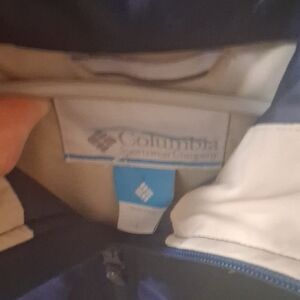 Stylish Columbia jacket with a colorblock design. Features navy, beige, and neon yellow panels.