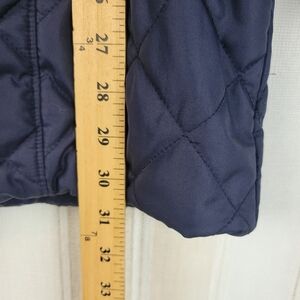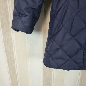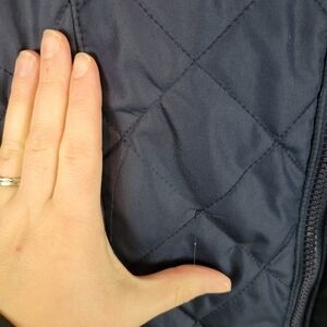 Does have a few small flaws (see photos), overall in good condition, longline longer length, double zipper.